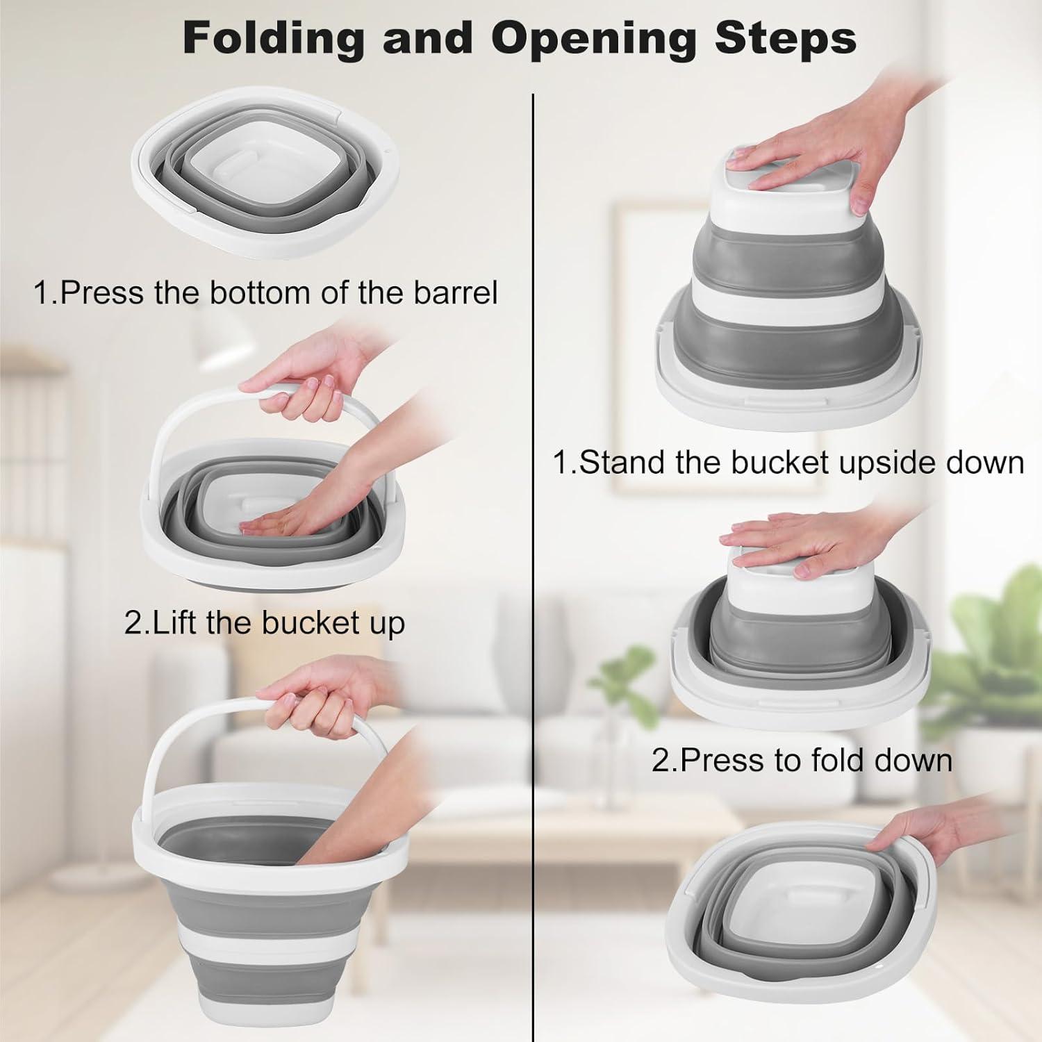 Triple Reinforced Plastic Support: Rigid plastic parts at top, middle, and bottom of the 1.3 Gallon collapsible bucket withstand 5L water without buckling. Ideal to be used as a car wash bucket requiring stability during scrubbing, a collapsible mop bucket dragged across floors, a collapsible sand bucket for travel, a laundry bucket for laundry room, or a cleaning bucket for household use. Outperforms flimsy small buckets without plastic band design for professional cleaning supplies, camping essentials, beach supplies and RV supplies.